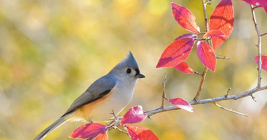 Eventually, I discovered that my bird was a tufted titmouse. I came to this conclusion the way every birder does. You start to notice details about the bird, like how big it is or what color its feathers are. You look in the field guide and see something that could be your bird, but no, this bird in the book has some yellow on its head, and the one I’m looking at on the branch doesn’t have any yellow. Through trial and error, you look back and forth between the bird on the branch and the bird in your book, until — Aha! There it is! Tufted titmouse.